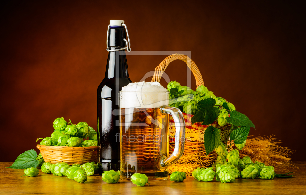 Stillleben Flasche und Maß Bier mit Hopfen