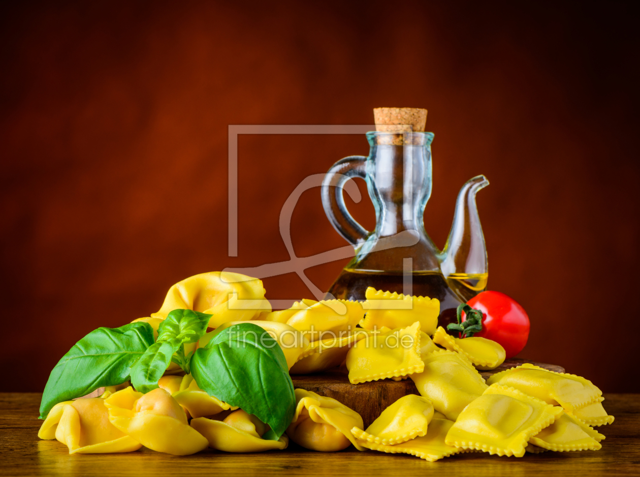Stillleben mit Ravioli und Tortellini mit Öl