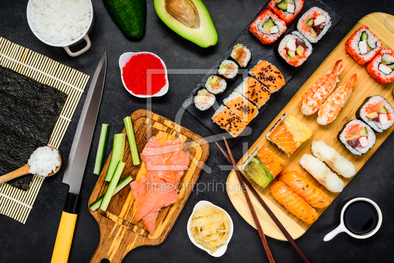 Sushi und Zutaten auf Schwarzem Hintergrund