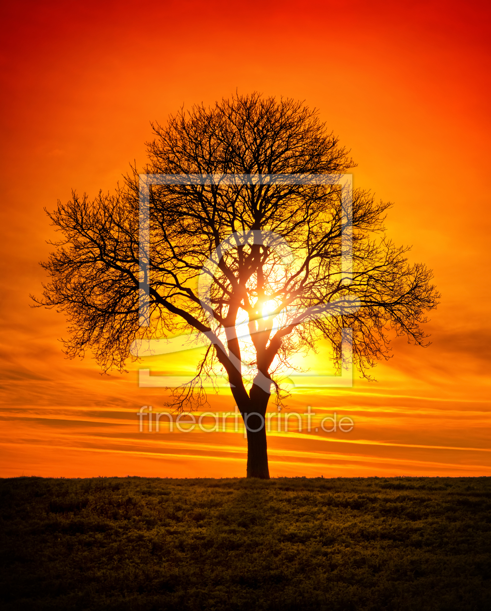 Einsamer Baum mit leuchtender Sonne im Hintergrund