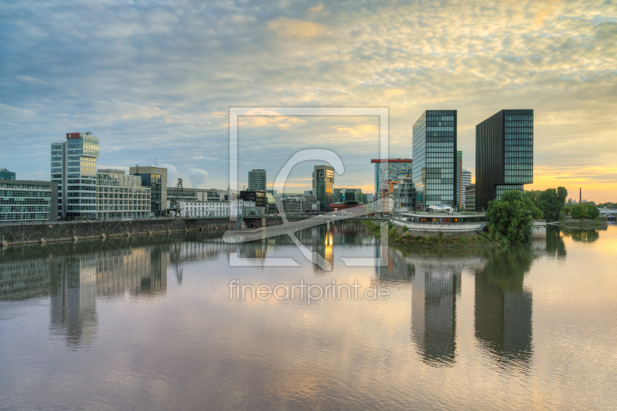 Düsseldorf Skyline mit Schiff bei Sonnenunterg...