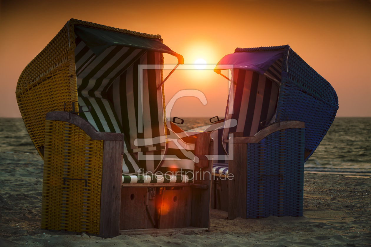 Strandkörbe am Strand von Wyk auf Föhr bei Sonnenaufgang