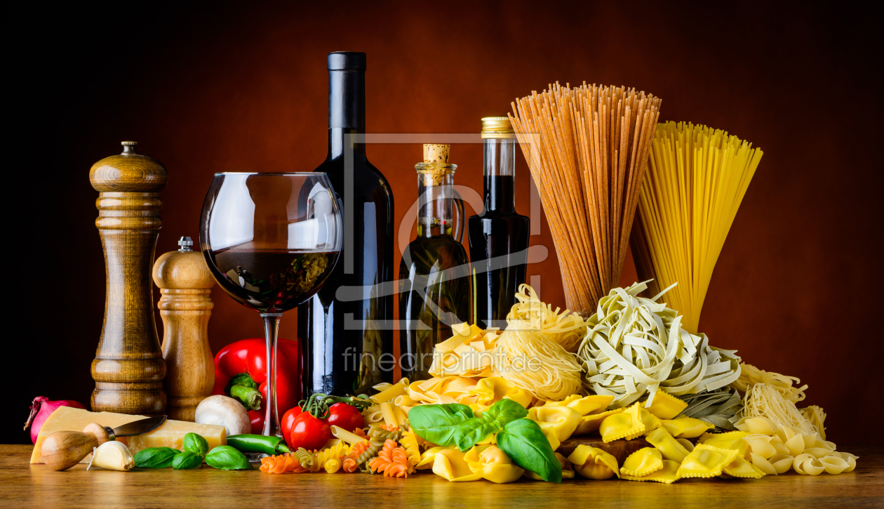 Sillleben mit Rotwein und Verschiedene Pastaar...