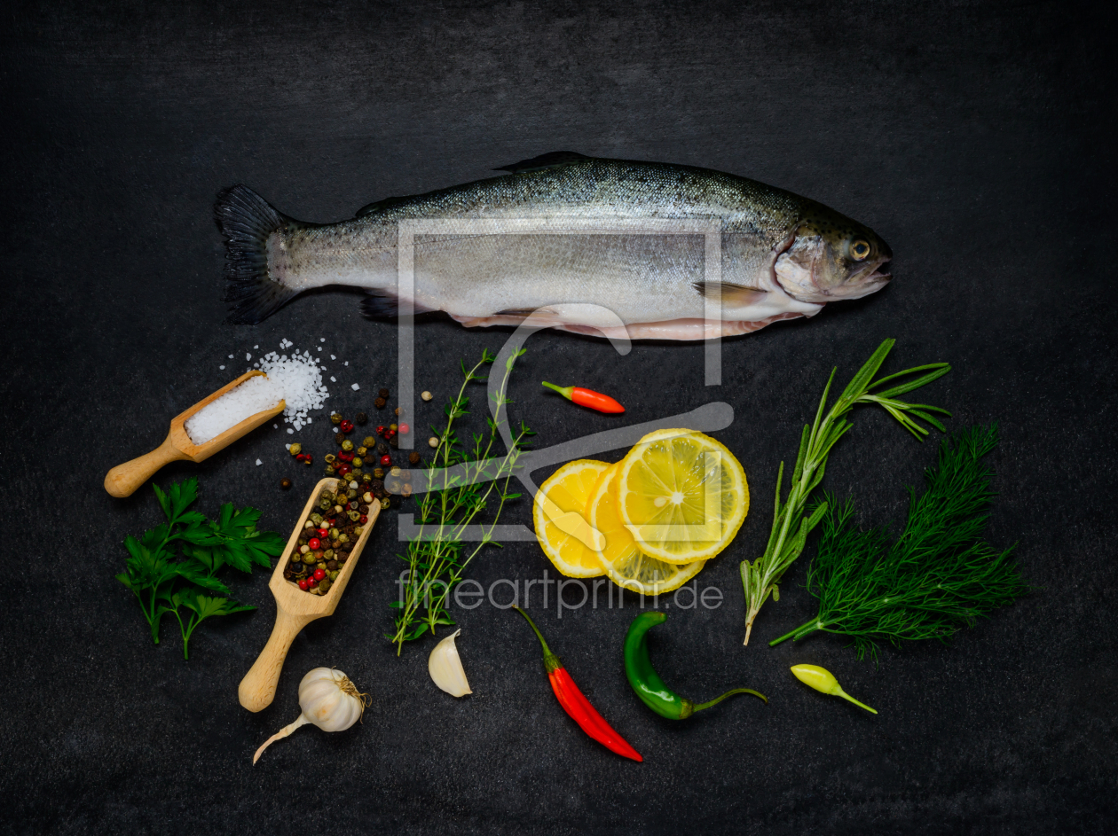 Roher Fisch auf einem Herz Kochbrett mit Zutat...