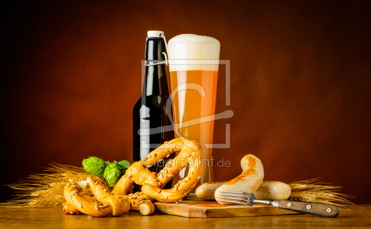 Stillleben mit Weißbier Brezel und Wurst