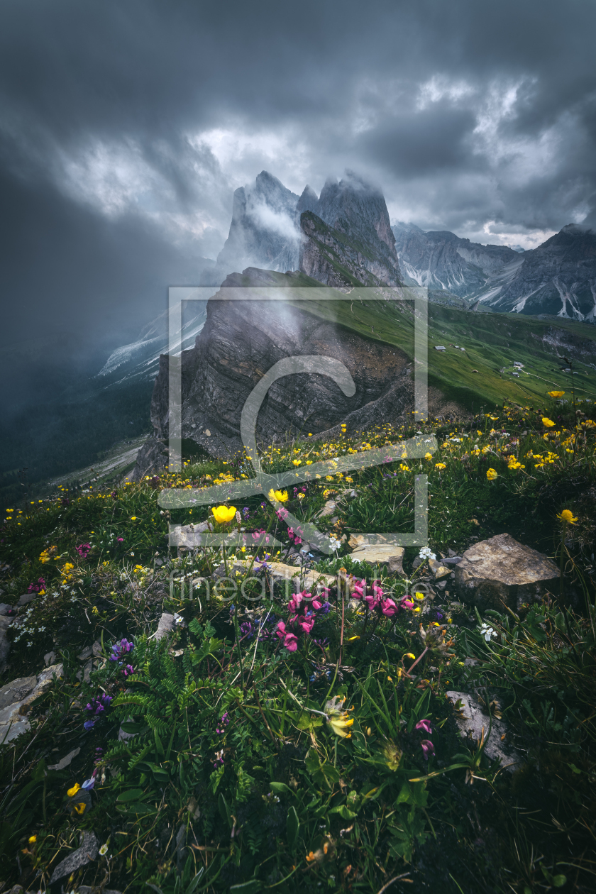 Dolomiten Seceda mit Geisler Gruppe bei Regen