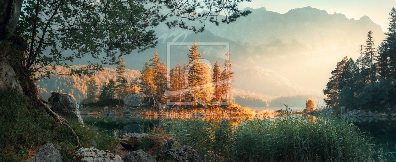 Panoramalandschaft an einem Bergsee im Morgenlicht