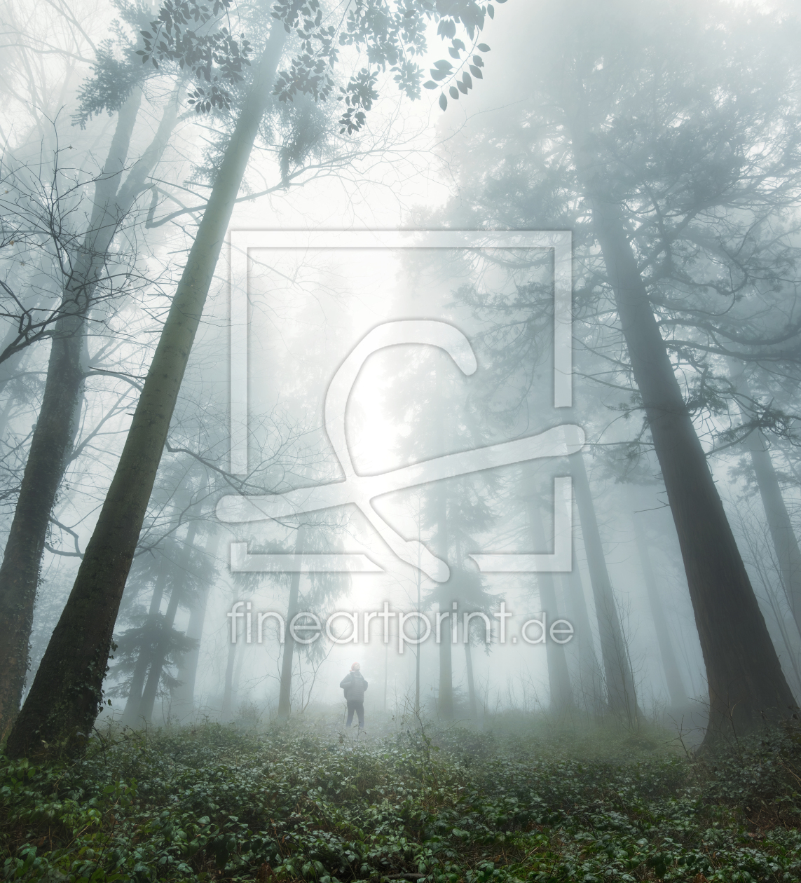 Wanderer steht im Nebel unter hohen Redwood Bäumen