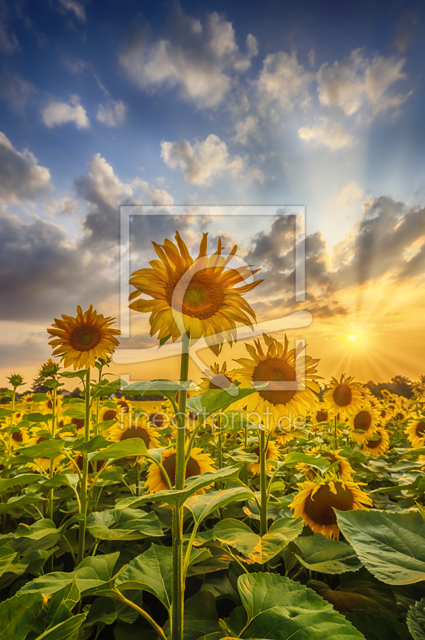 Aussicht auf Sonnenblumen im Sonnenuntergan...