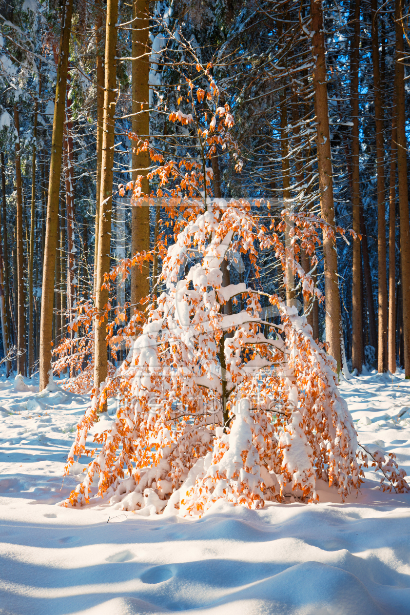 verschneite Buche im Winterwald