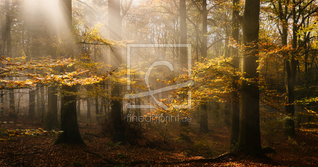 Sonnenstrahlen durchfluten Herbstbäume im Nebel