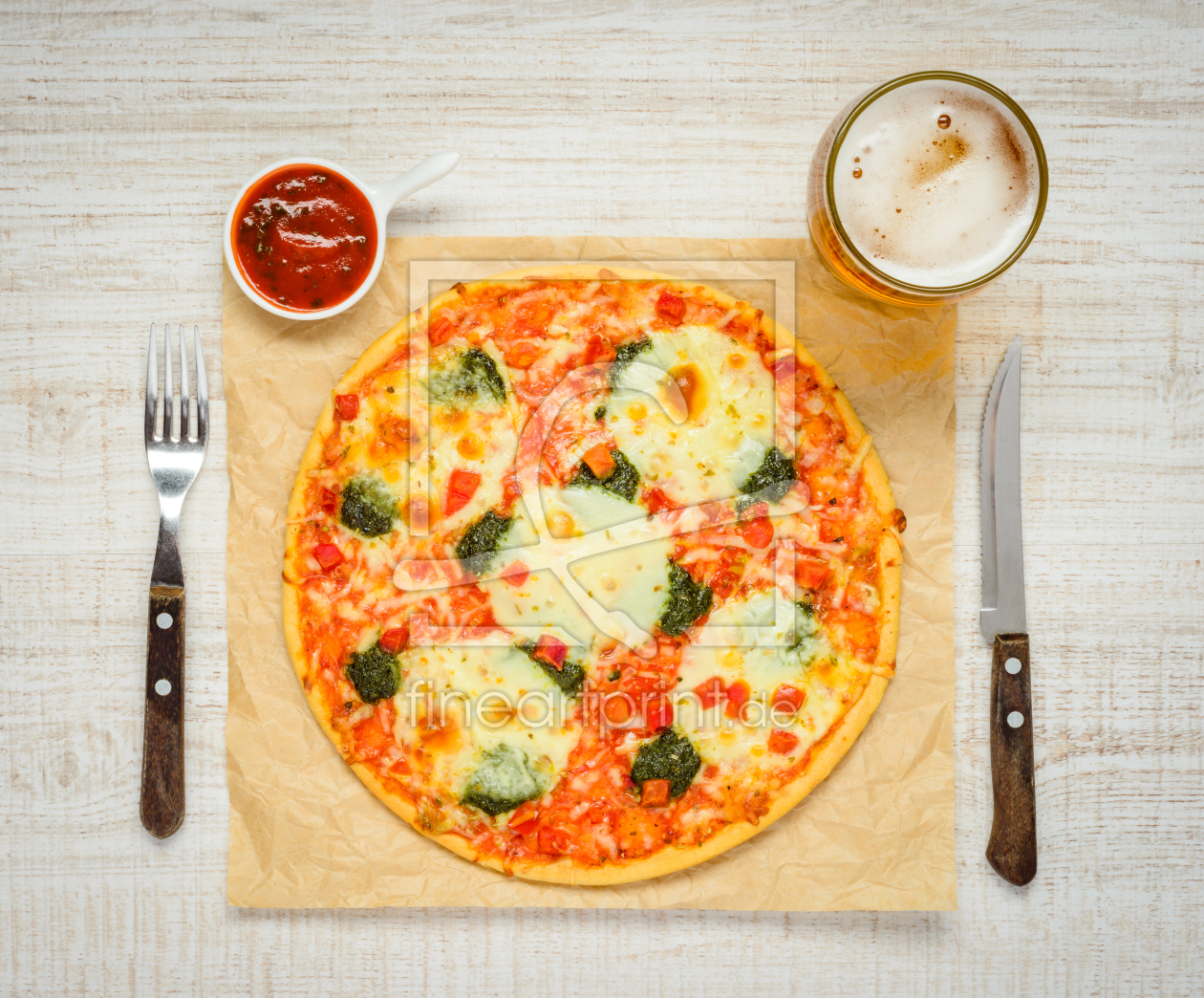 Pizza mit Soße und Glass Bier
