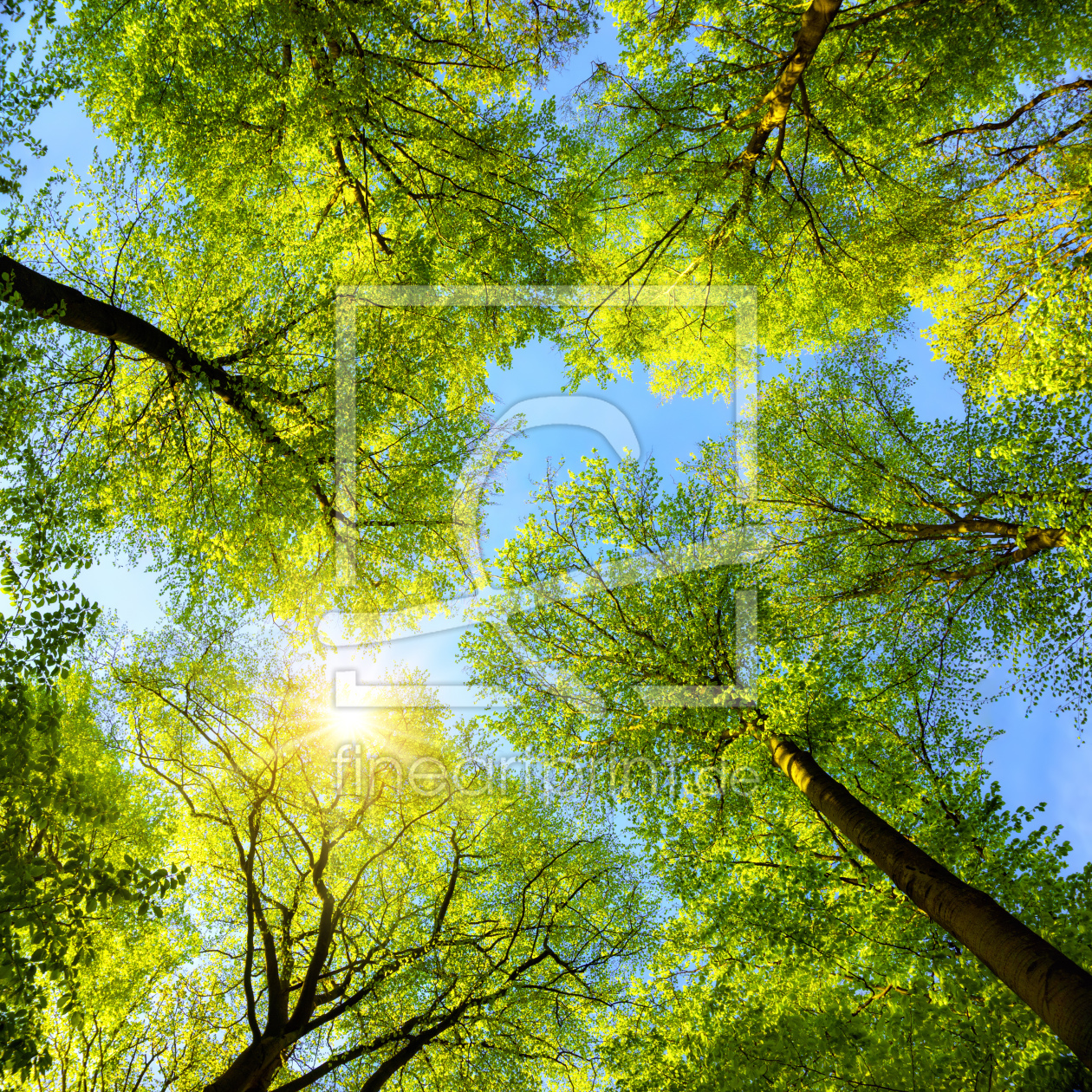 Grüne Baumkronen im Sonnenlicht und blauer Himmel