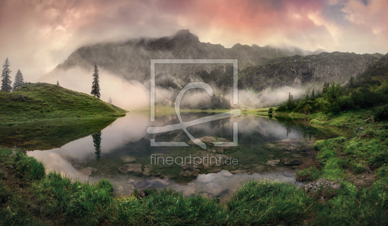 Bergsee im Nebel bei dramatischem Sonnenaufgang