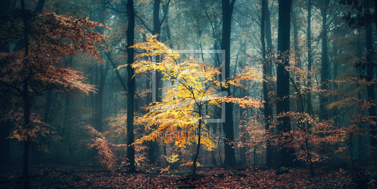 Sonnenstrahlen durchfluten Herbstbäume im Ne...