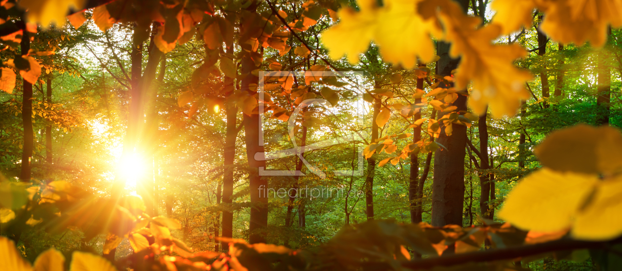 Goldene Waldszene mit Stahlen von Licht