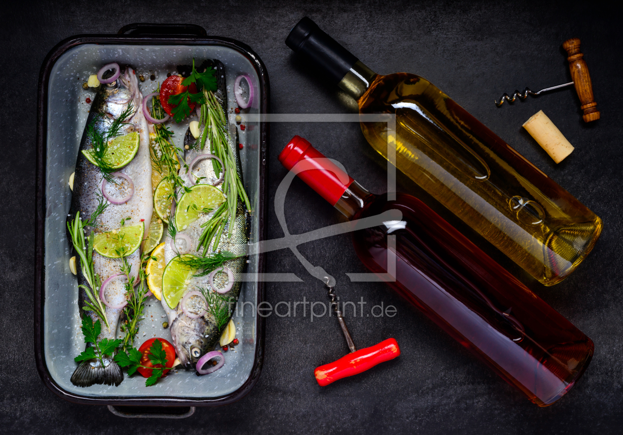 Roher Fisch auf einem Herz Kochbrett mit Zutat...