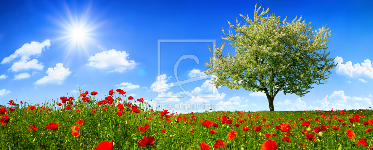 Einsamer Baum auf einem Feld mit Mohnblumen