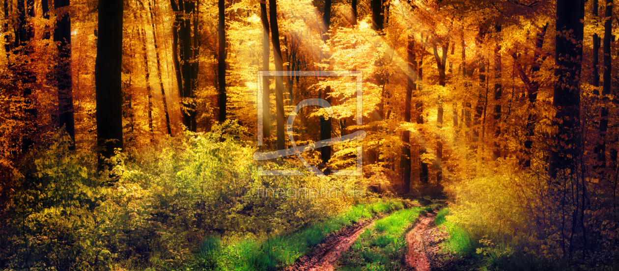 Lichtstrahlen fallen auf herbstlichen Waldweg