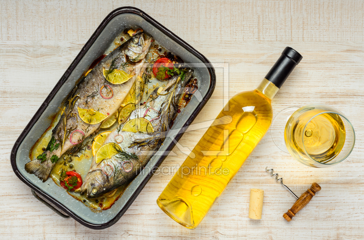 Gebackener Fisch mit Rosewein auf Weiß