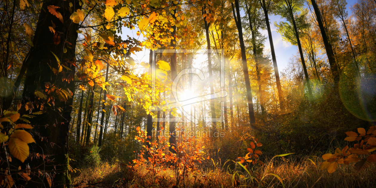 Bild-Nr: 12906123 Sonnenstrahlen durchfluten Herbstbäume im Nebel Erstellt von: Smileus