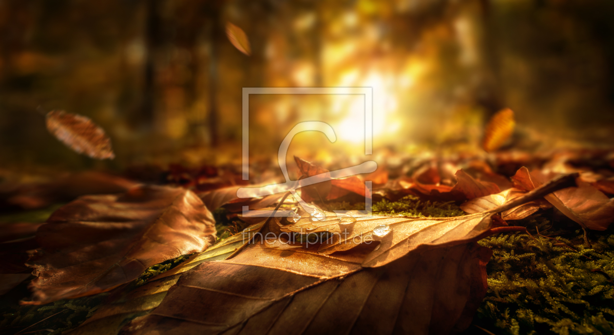 Herbstblätter mit leuchtender untergehender Sonne