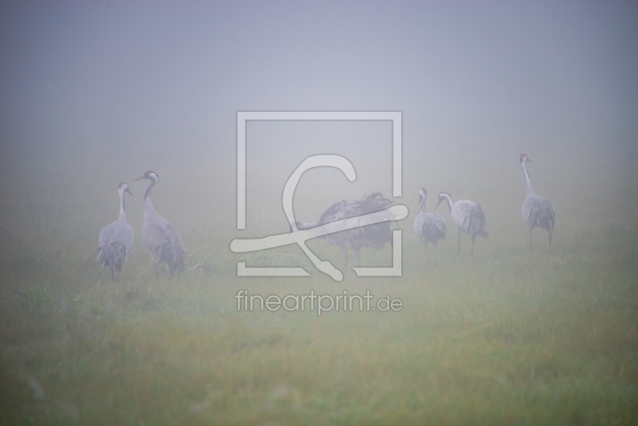 Kraniche in einer Nebellandschaft