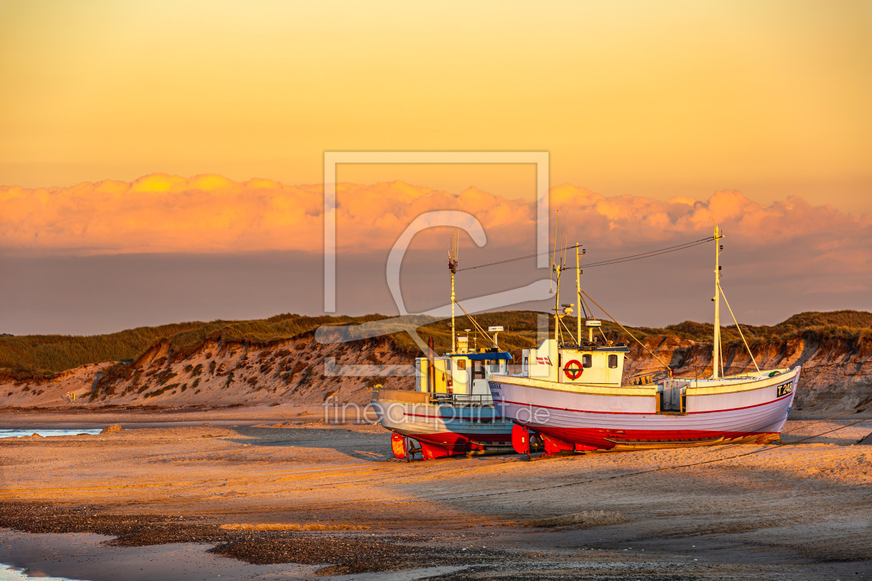 Fischerboot am Strand bei Sonnenaufgang