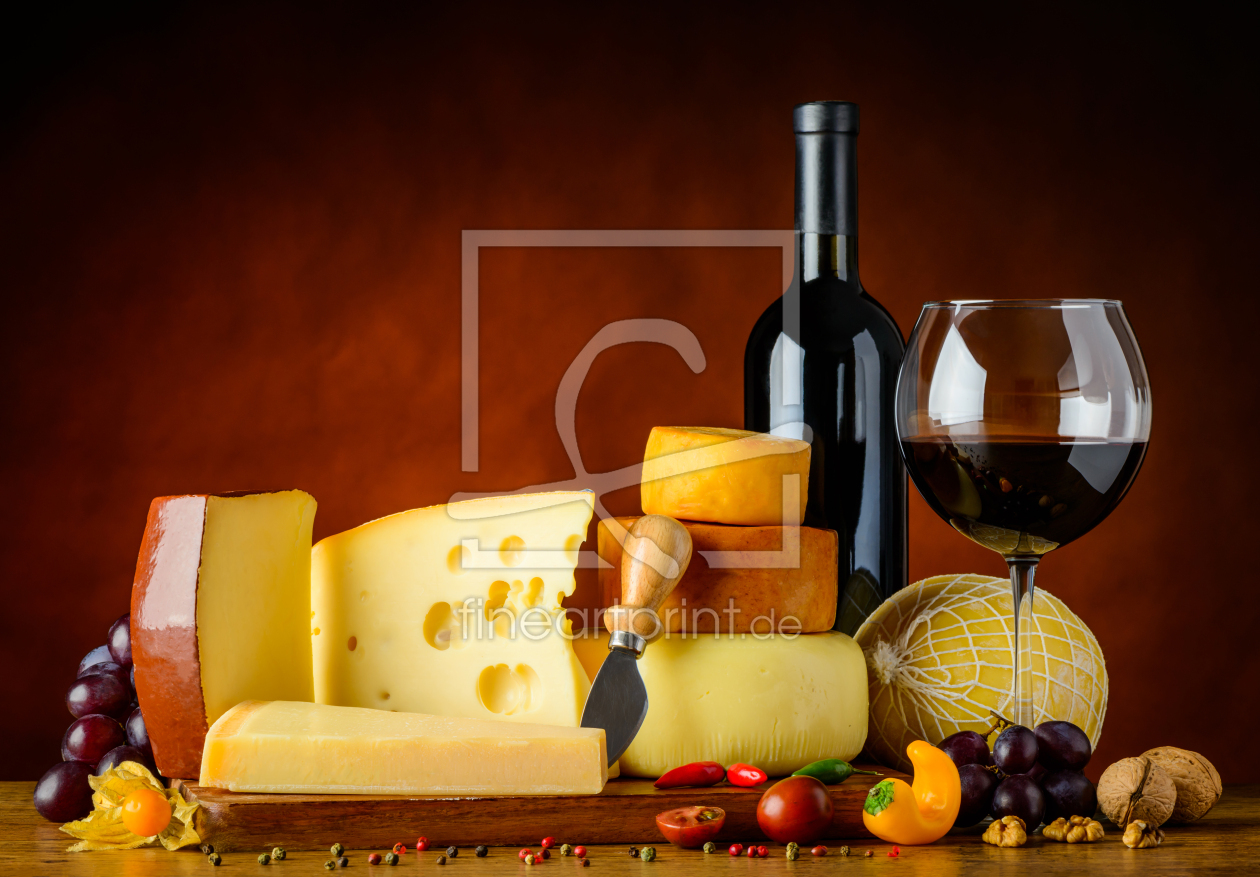 Stillleben Rotwein mit Schimmelkäse und Weint...