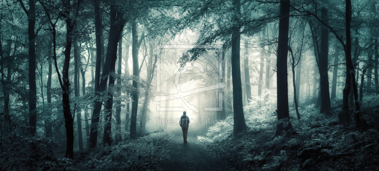 Zwei Menschen spazieren im nebligen Herbstwa...